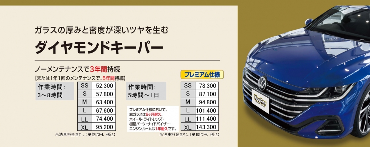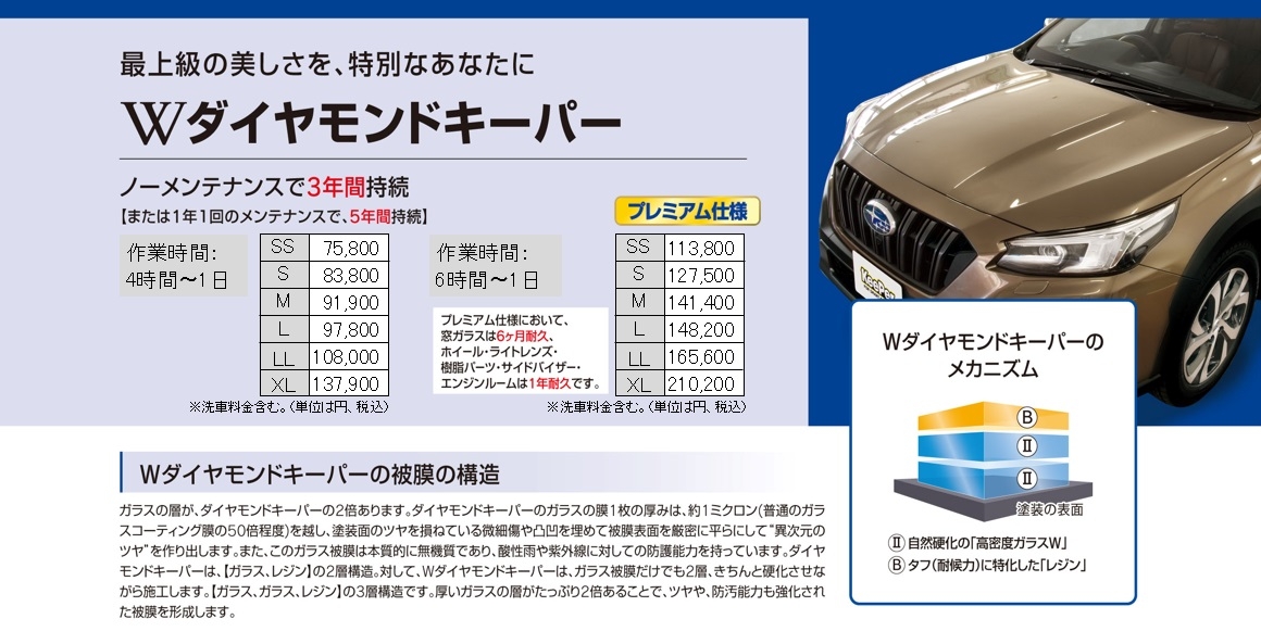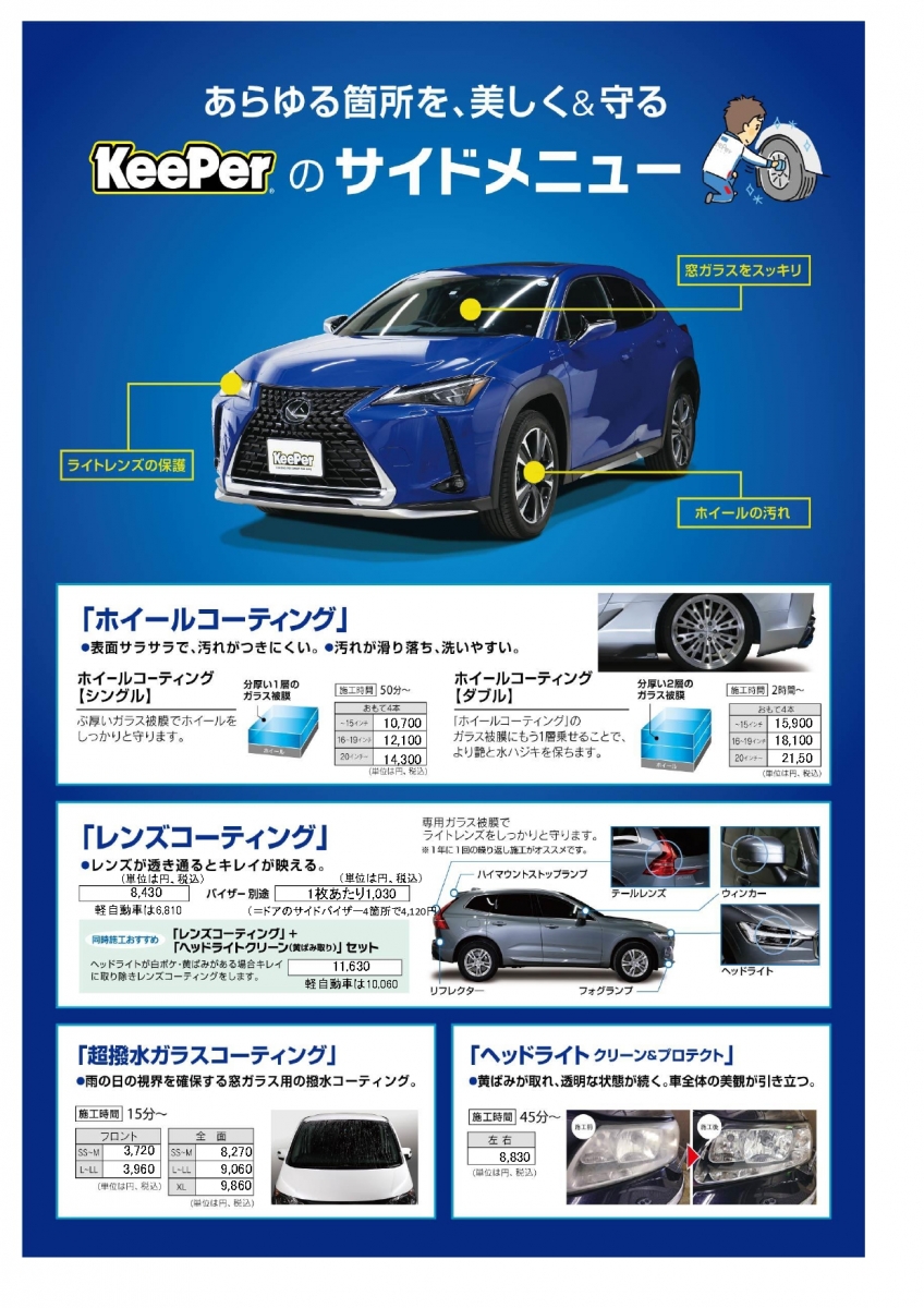 EXキーパーに加えて、トランク・ボンネットの裏・ドアの隅やヒンジなど、外から見えない塗装がされているあらゆる部分にEXキーパーを施工します。さらに、フッ素ガラスコーティング、ホイールコーティング、レンズコーティングが加わった、全キーパーシリーズの中で最もプレミアムなコーティングです。