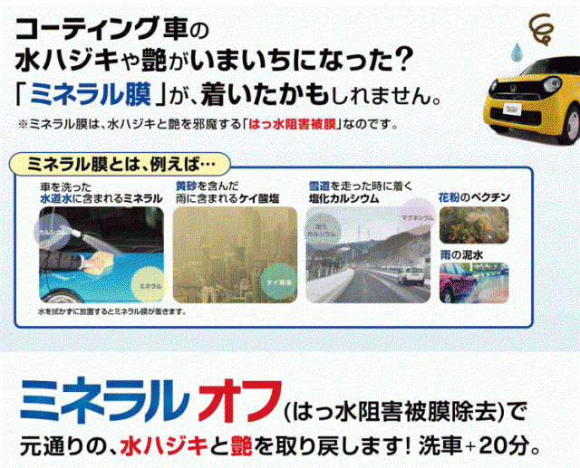 これらは水道水、地下水、黄砂まじりの雨、泥水、雪解け水等に含まれ、車体にかかって水が乾くと、無機質のミネラルが残って膜になるのです。