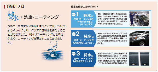 車の使用状況はひとさまざま... 青空駐車... 忙しくて洗車する暇が無い... ミニバンは大きくて天井にとどかない... などなど... 愛車のキレイを保つのは一苦労ですよね 特に黄砂やPM2.5、鳥のフンや高速で付いた虫、 付着したまま時間が経つとコーティングに悪影響も... そこで当店ではコーティング施工後のキレイをずっと保てるように 純水手洗い洗車 を通常価格より御安くし、日常メンテナンスとして 日々の洗車をお求め安く 価格設定しております。 月に1・2度の洗車を推奨しており 最良の状態でお客様の愛車のキレイを お手伝いさせて頂ければと考えております。