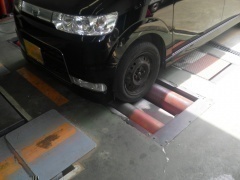 一番最初に検査するのが「サイドスリップ測定」左右のフロントタイヤがちゃんと前を向いているか検査します。異常があれば調整しますここが狂ったまま走行するとタイヤが変な摩耗をしてしまいます