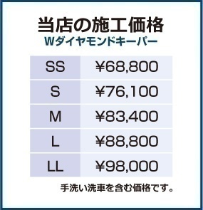 ダイヤモンドキーパーを越えるコーティング。Wダイヤモンドキーパー。ダイヤモンドキーパーのガラス皮膜の2倍の皮膜。ツヤの出方が違います。とにかくキレイ。よくダイヤモンドキーパーとそんなに変わらないんでしょ?と聞かれますが、全然違いますから。塗装の色が深く、ツヤツヤになります。是非体感してみてください。