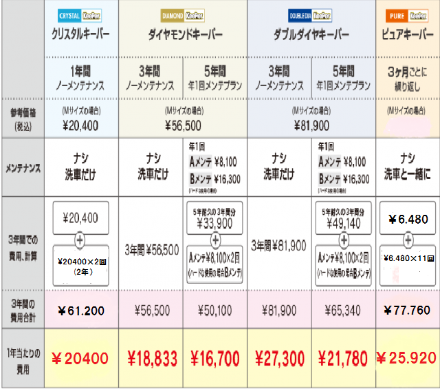 メンテナンスをせず、洗車だけで、3年間持続目安のプランと