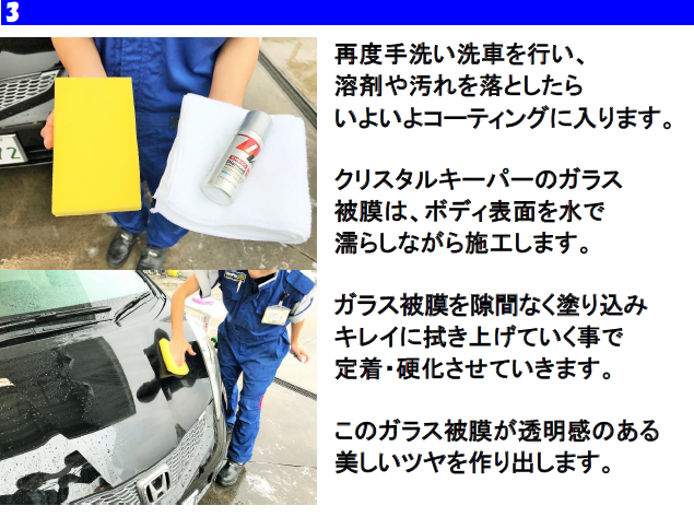 A、ご安心ください、傷みません。 私たちのケミカルと技術は「塗装を絶対に傷めない」というポリシーを強く持っています。そのため、塗装を傷めるトルエン、キシレンなどの有機溶剤は一切含まれておりません。施工においても万全を期しております。