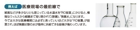 純水とは、通常の水道水の中に溶け込んでいる炭酸カルシュウム、珪酸塩等あらゆるミネラルを分子レベルで濾過する機能があります。日本では大きな病院に設置されて、水道水をRO装置に通して無菌水を作っています。