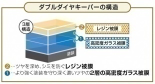 ガラスの層が、ダイヤモンドキーパーの2倍あります。ダイヤモンドキーパーのガラスの膜1枚の厚みは、約1ミクロン(普通のガラスコーティング膜の50倍程度)を越し、塗装面のツヤを損ねている微細傷や凸凹を埋めて被膜表面を厳密に平らにして”異次元のツヤ”を作り出します。また、このガラス被膜は本質的に無機質であり、酸性雨や紫外線に対しての防護能力を持っています。 ダイヤモンドキーパーは、【ガラス、レジン】の2層構造。 対して、Wダイヤモンドキーパーは、ガラス被膜だけでも2層、きちんと乾燥させながら施工します。【ガラス、ガラス、レジン】の3層構造です。 厚いガラスの層がたっぷり2倍あることで、ツヤや、防汚能力も強化された被膜を形成します。