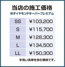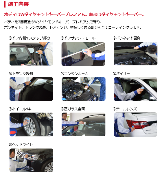 Wダイヤモンドキーパープレミアムは2層の分厚いガラス被膜と、そのガラス被膜を守り艶と撥水が増すレジン皮膜の3層からなるコーティングにヘッドライト、窓ガラス、ホイール、テールレンズ、エンジンルーム、ドアの隙間など、出来る箇所は全てコーティングするというプレミアムなメニューです。