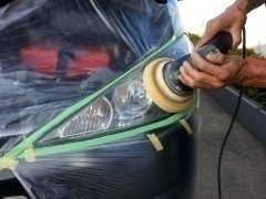 機械を使ってしっかり磨いているところ。出来上がりは新品のヘッドライトレンズと違いは有りません!