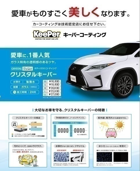 当店、最上級コーティングです。 ★お車のボディーはダブルダイヤキーパー! ★お車の見えない部分(上記10項目)まで施行します! 外側と内側全てコーティングすることで、お車の価値を高めます。 施工時間:約2日? ※お車の状態により施工時間が変更となる場合がございます。 お電話でのご予約、ご来店でのご予約どちらでも大歓迎です! 施工の際は、代車を無料でお貸出し致します。 ※代車が無い場合は予定を変更いただく場合がございます。