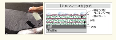 ハンドスプレー型のコーティング剤は、一般的にコーティングの下地処理をせずに水垢の残ったままの面に塗る重ねるので汚れの膜の上からコーティングを乗せることになります。汚れの層、コーティング層を重ねる毎にミルフィーユ型の水垢となり、愛車の美貌を損なっていきます。