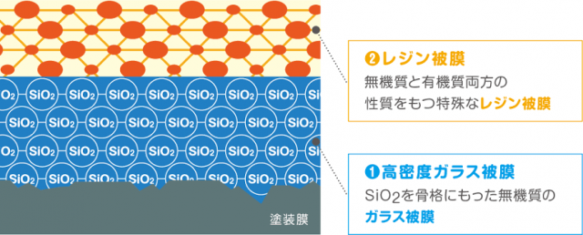 ダイヤモンドキーパーは、独特のガラス被膜と特殊なレジン被膜の二重の被膜で出来ています。 柔軟かつ分厚く「深いツヤ」を出すアルコキシオリゴマーの「ガラス被膜」1層目の「ガラス被膜」は、分子的結合を比較的低分子にコントロールされたアルコキシオリゴマーであり特殊な柔軟性があります。だから、塗装の熱収縮に追従することが出来、分厚い被膜を造ってもはがれません。その厚みは約1ミクロンを越し、塗装面のツヤを損ねている微細傷や凹凸を埋めて被膜表面を厳密に平らにして異次元のツヤを作り出します。また、このガラス被膜は本質的に無機質であり、酸性雨や紫外線に対しての防護能力を持っています。また、時間をかけてじっくりと空気中の水分と反応させて被膜を硬化させるので、非常に密度の高いボディガラスコーティング膜を形成します。 2層目の特殊な「レジン被膜」は無機質のガラス被膜の上に密着することが出来、しかもその密着面の反対側にあたる表面には有機質の性質を持つ特殊なレジン被膜です。だから、多くのガラスボディコーティングのように無機質の表面に、水道水などに含まれる無機質のミネラルが固着して出来る醜い「水シミ」を、ダイヤモンドキーパーは表面を有機質にする事によって本質的に防止する事が出来ます。また、ガラス被膜とは違う屈折率を持つ透明なレジン被膜は、ガラス被膜単体とは異質のより強いツヤと強撥水性を出します。