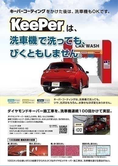 ピュアキーパーとは、「塗装の為になるコーティング」をコンセプトに、ワックスの時代の発想を180度転換した新しい考え方{分子量200000以上の高分子共重合体(コ・ポリマー)}から出来ています。コ・ポリマーは分子同士が、油性汚染物質をコーティング膜内に浸透させにくい立体的な網目状の被膜を形成します。この被膜が、ピュアキーパーの施工を繰り返すことで(キズを埋め)、美しいボディへと育てていきます。約3か月ごとに新車に戻っていくような感動を味わえます。全国で、年間250万台を施工されているベストセラーのポリマーコーティングです。