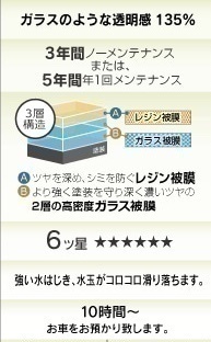 ・フッ素ガラスコーティングの耐久性は3ヶ月から6ヶ月。施工時間は15分からですが、油膜取りの作業から、フッ素コーティング、乾燥、拭き取りという工程をキッチリ行うと30分程いただきます。