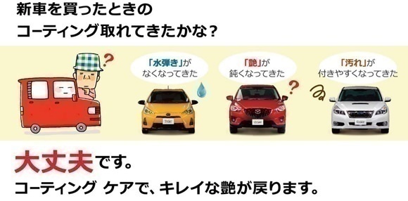 はっ水がなくなり、キレイじゃなくなったらまたコーティングケアをやってください。キレイにしたい時に洗車感覚でやって頂くと良いメニューです。
