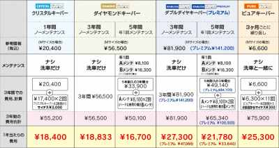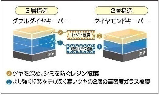 耐久期間 1年間 ノーメンテナンス 洗車だけで1年耐久 ツヤ ガラスのような透明感 100% 汚れにくさ 5ッ星 ★★★★★☆☆ 水はじき 強撥水 強い水弾き 水玉になる 施工時間 2時間 洗車時間含む