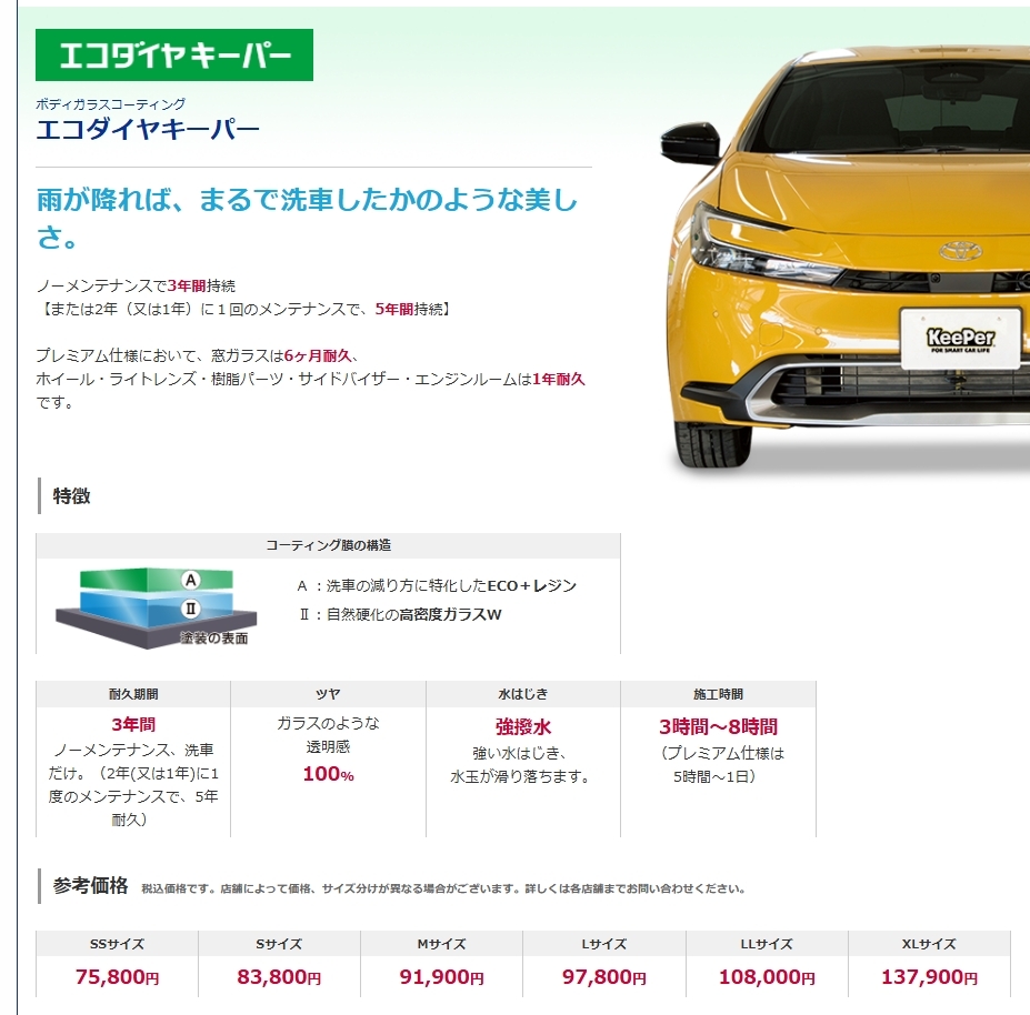 プレミアム仕様において、窓ガラスは6ヶ月耐久、ホイール・ライトレンズ・樹脂パーツ・サイドバイザー・エンジンルームは1年耐久です。