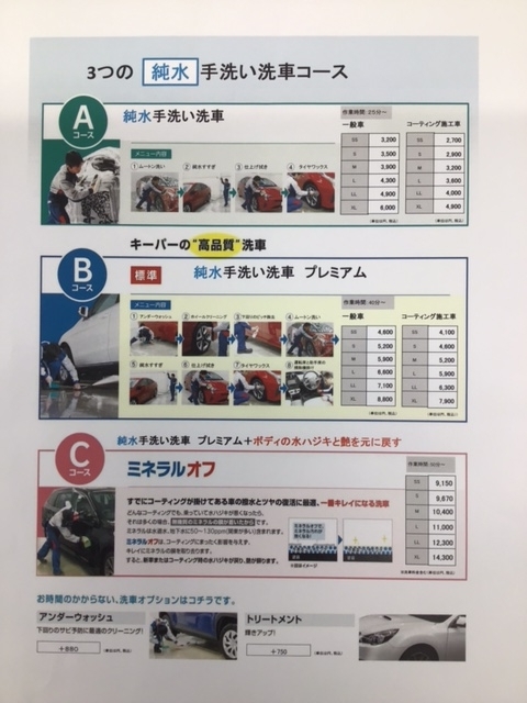 以下の内容が、当店の『手洗い洗車』『コーティング』のメニューになります。