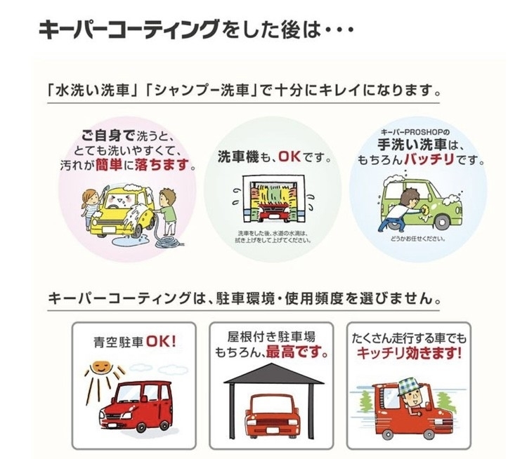 作業時間の中に必要な乾燥時間などは含まれております。キーパーコーティングは施工完了後、例えば雨の中お帰りでも効果が変わることはありませんのでご安心ください。