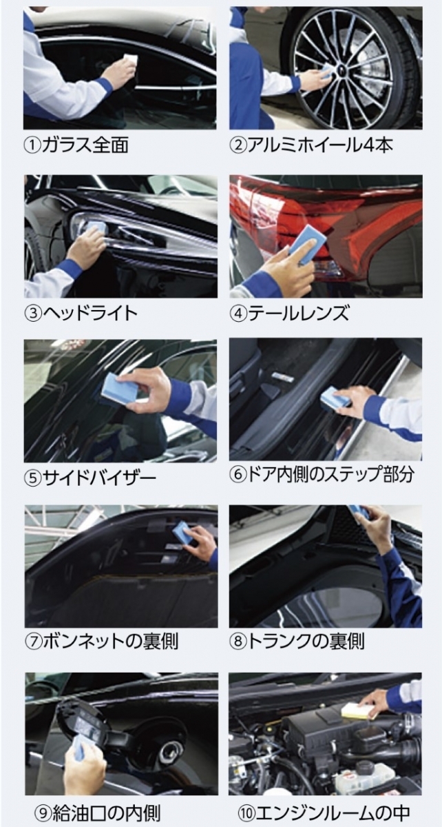 例えば、ブレーキダスト、泥汚れから守る「ホイールコーティング2」雨の日の視界を確保する「窓ガラス撥水コーティング」ヘッドライトの黄ばみ・くすみを取り除き、コーティングする「ヘッドライトクリーン&プロテクト」下回りの錆を防止する「アンダーコート」など各部分をコーティングするメニューをご用意いたしました。