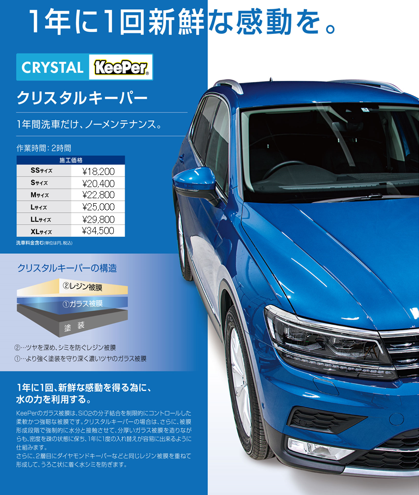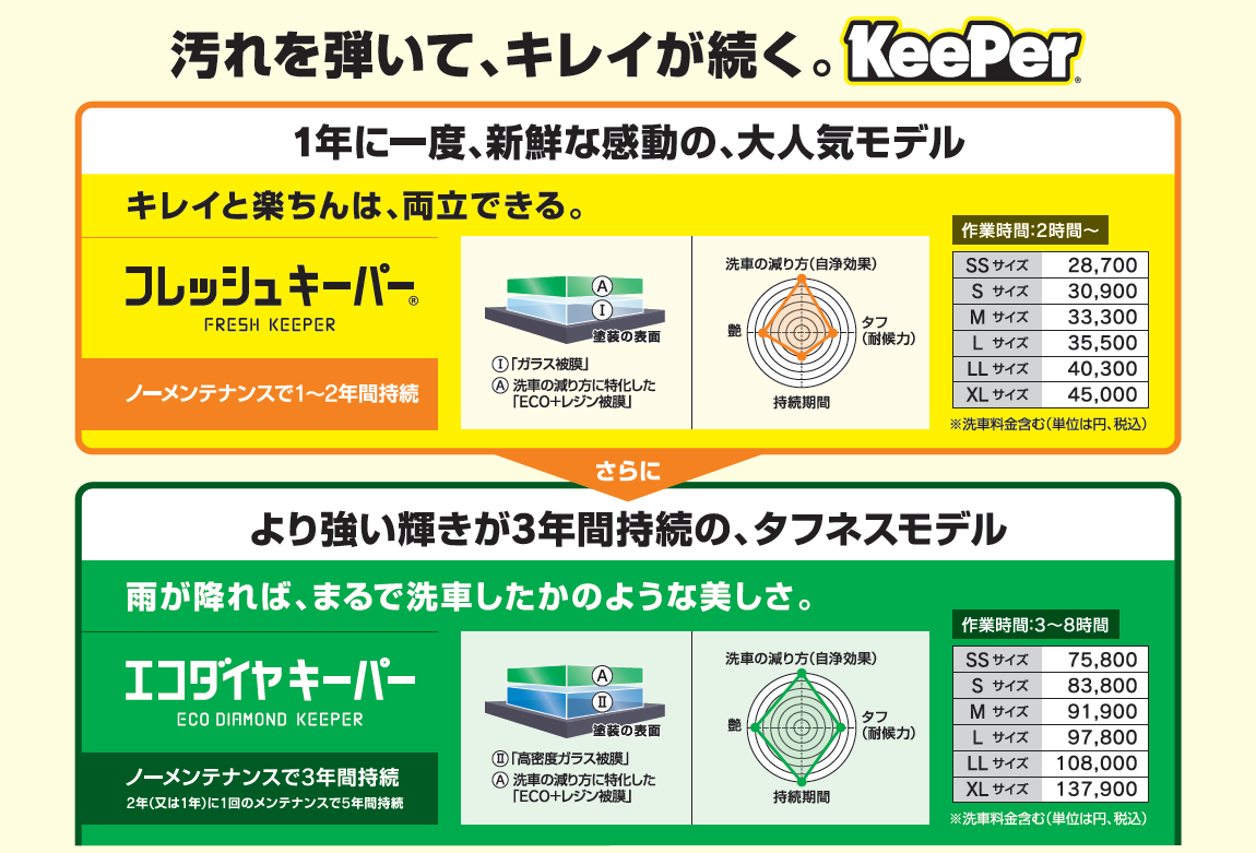 フレッシュキーパーは、汚れの密着を防ぐ独特な防汚能力を持ち、ホコリが降り積もっても塗装表面には密着せず、自然の雨が降れば元々持っている撥水力で、雨と一緒に汚れが流れ落ち、まるで洗車をしたようにキレイになります。