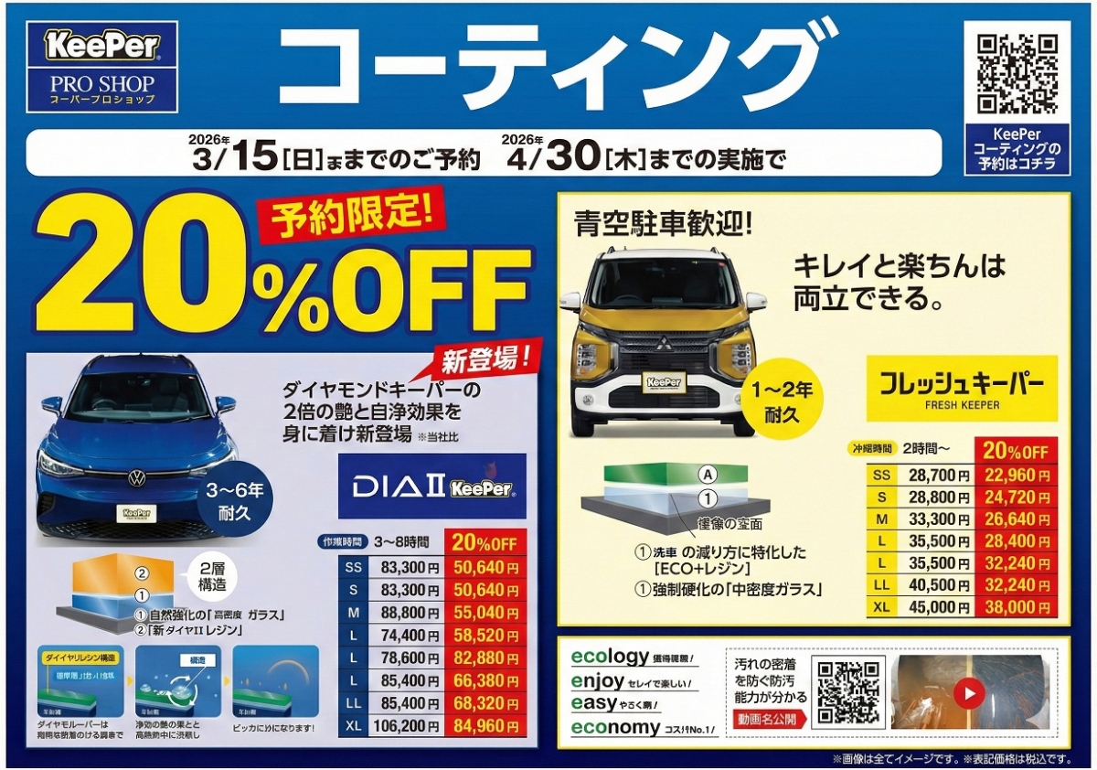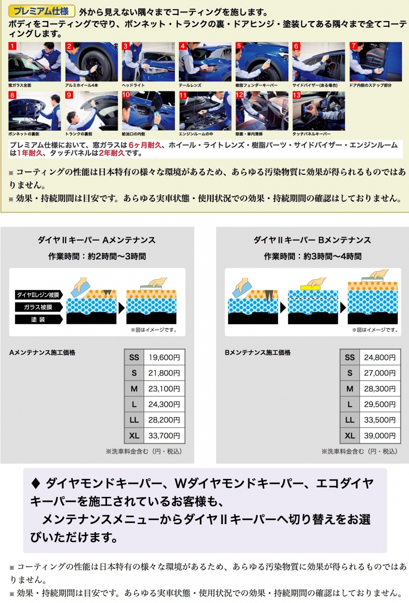 キーパーコーティング(プレミアム仕様を含む)はWeb予約割引と合わせて10%OFF、その他のメニューは5%OFFでご利用頂けます。