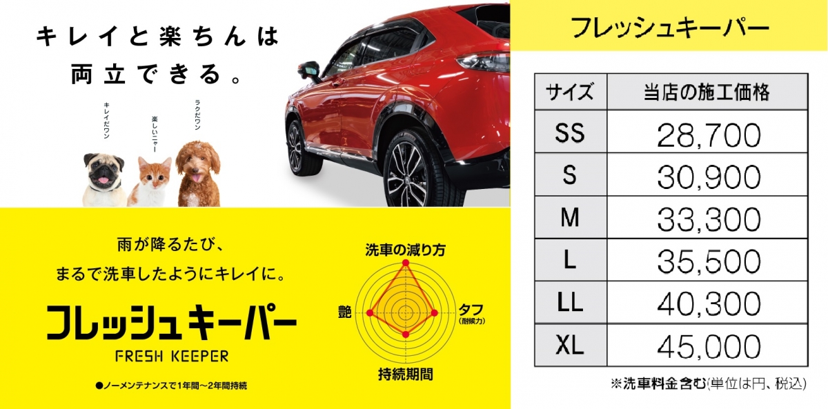 大好評のフレッシュキーパーは手頃な価格で始めやすいメニュー✨施工時間約120分〜 SSサイズ28,700円〜 フレッシュキーパーは、汚れの密着を防ぐ独特な防汚能力を持ち、ホコリが降り