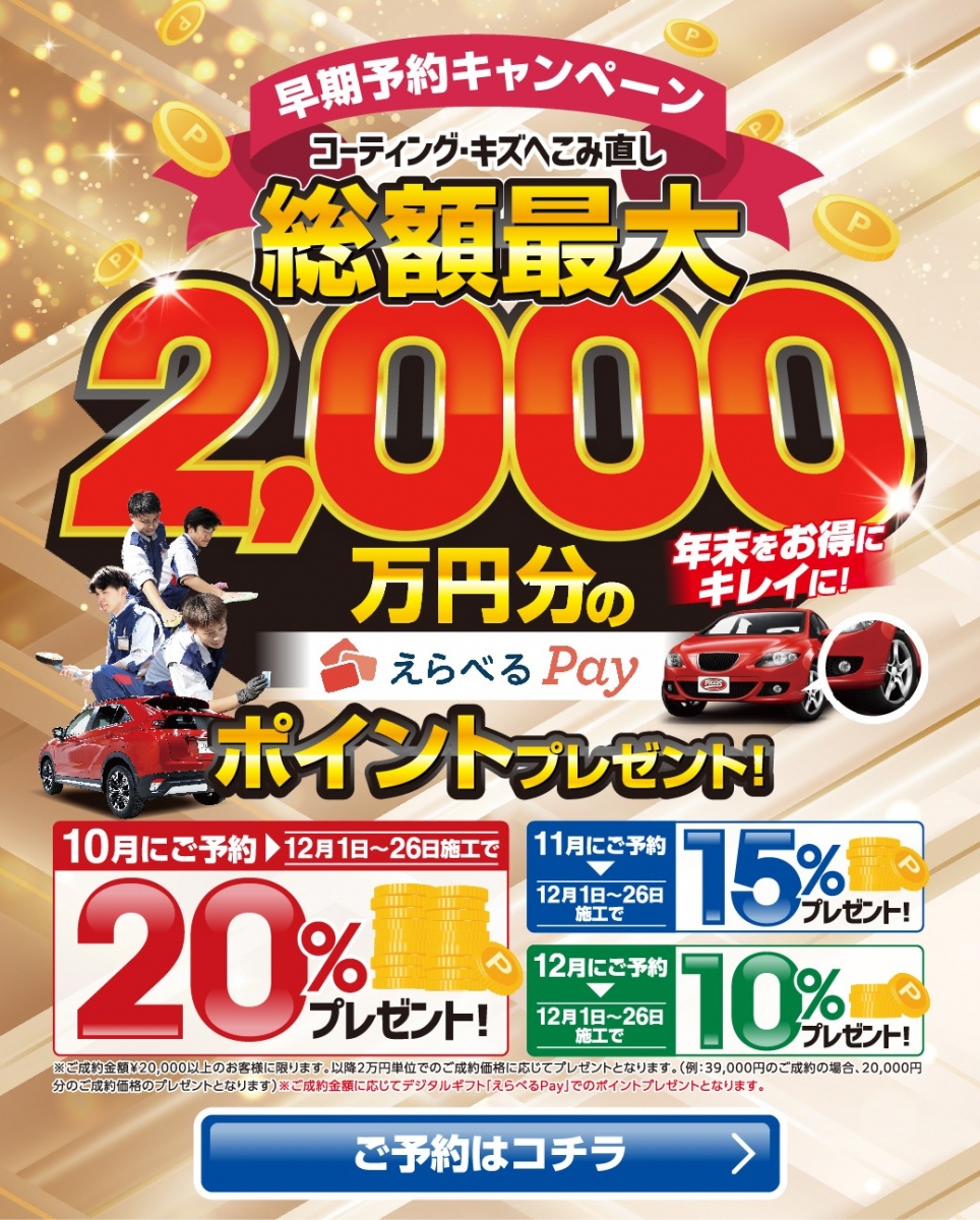 ※『えらべるpay』のポイント還元は、コーティング施工料20000円以上(税込・アラカルト商品含む)を施工されたお客様が対象です。