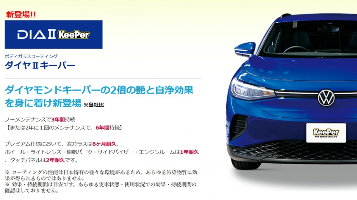 そこで当社では、より多くのお客様の愛車を守るきっかけや機会を増やし設けたいとの思いから、12月からの新商品DIAⅡキーパーおよびエコダイヤキーパー・フレッシュキーパー・Wダイヤキーパー・ダイヤモンドキーパー・クリスタルキーパーの6種類のコーティングメニューを年末年始特別価格として10%OFFでご提供する事にいたしました。