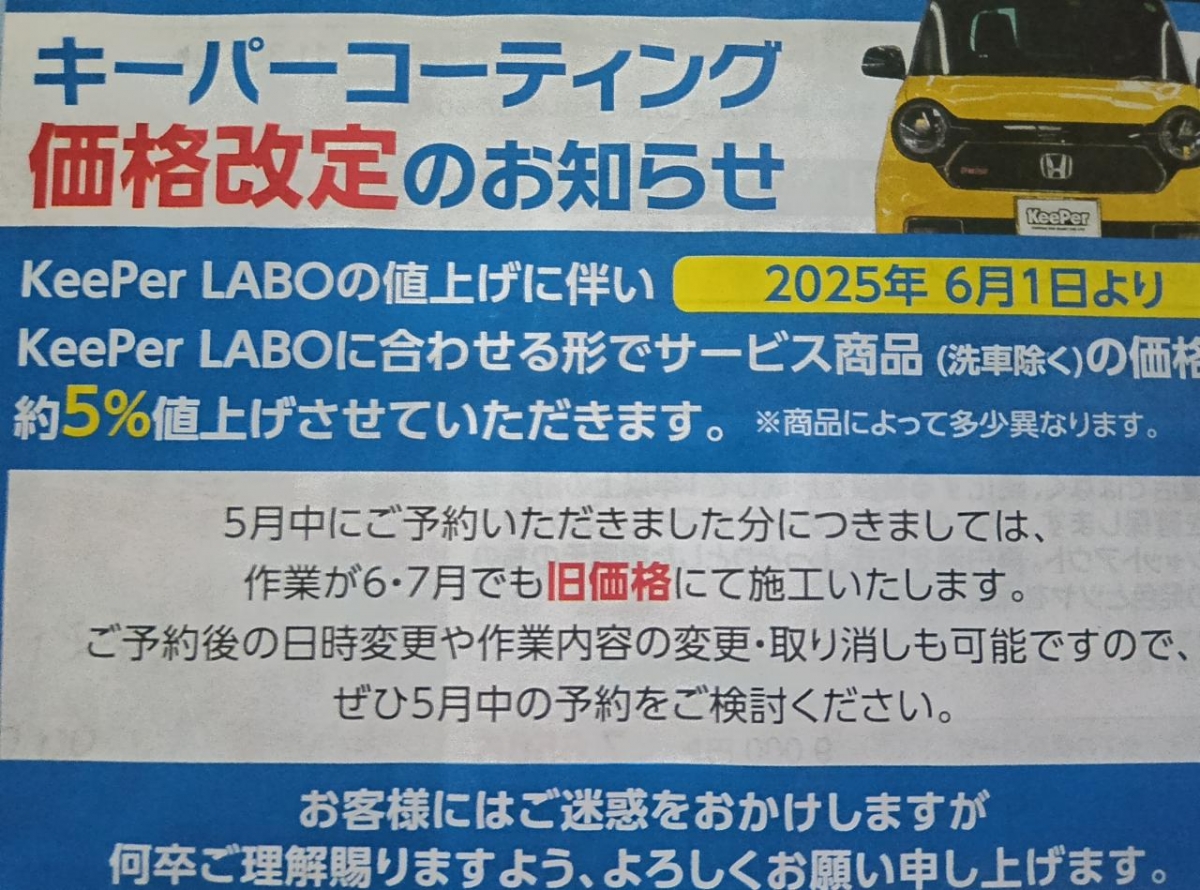 それと、お客様にご報告がございまして、6且1日からキーパーコティング価格改定のお知らせになります💦