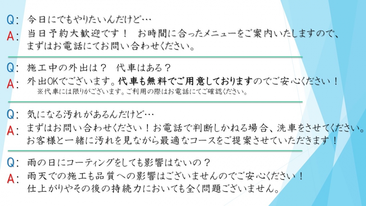 コーティング施工のお客様には代車も無料でご用意!お預かりでの施工もお任せください。