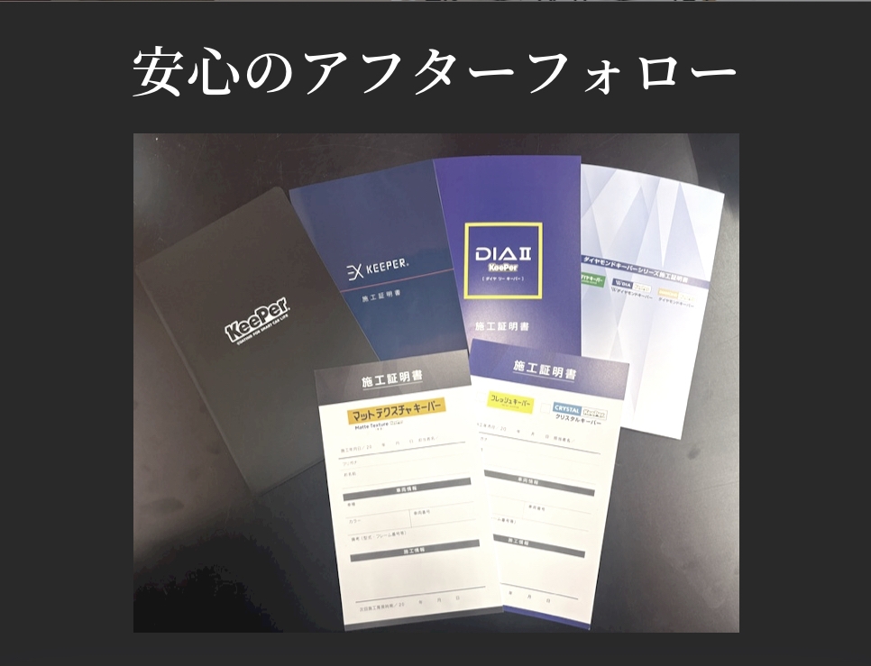 施工証明書は、引き渡し時にお渡し致しますので、お車のグローブボックス等に入れ、大切に保管くださいませ。