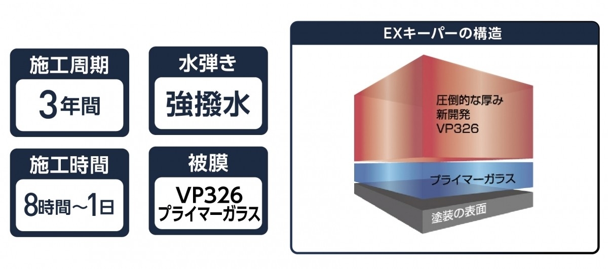 ☆EXキーパーの圧倒的な艶を生む『VP326』の下に定着を良くするプライマーガラスを施工する事で新車を超える艶と美しさを実感出来ます。