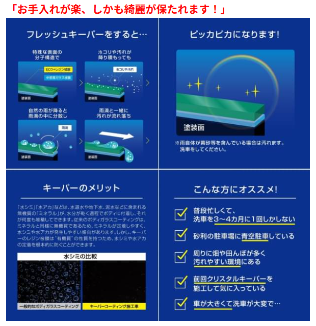 柔軟かつ固い、キーパー独自のガラス被膜を定着させることで驚きの輝きと艶を持続できます。