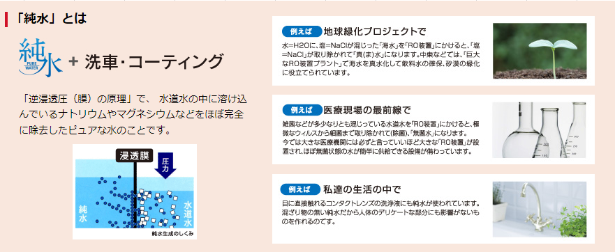 「純水」とは、水道水で洗車した際にうっすらとした白いくすみの原因となる不純物を取り除いた「キレイな」水のことです。