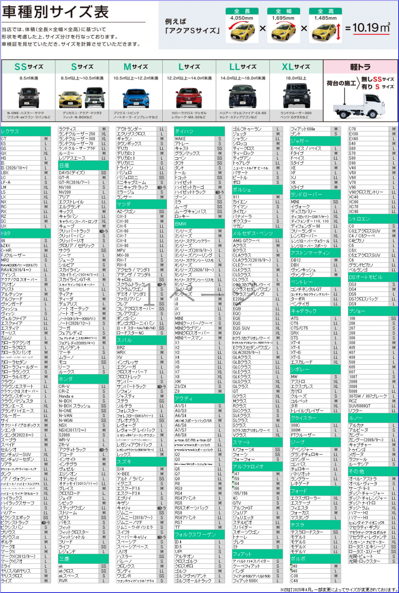 車の大きさによって料金が違います♪♪