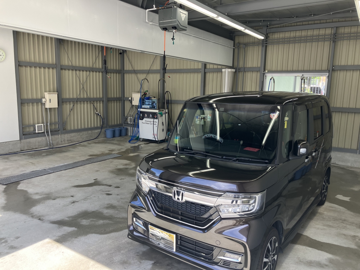 当店では『密閉型コーティング専用ブース』を完備しており、ブース内ではエアコン完備で施工中の水滴や溶剤などの乾燥焼き付きを防ぐため温度調整を行っております。洗車・コーティング作業時は水道水ではなくミネラル分を除去した『純水』を使用しており、お車の『キレイ』を一段引き上げる工程を標準化しています。