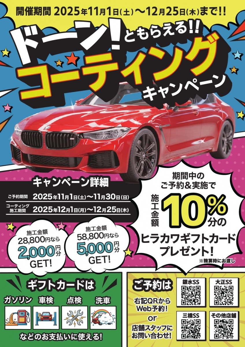コーティング施工や作業時間が2時間を超える場合、無料で代車をお貸ししております。 数に限りがございますので、早目のご予約をお願いします。