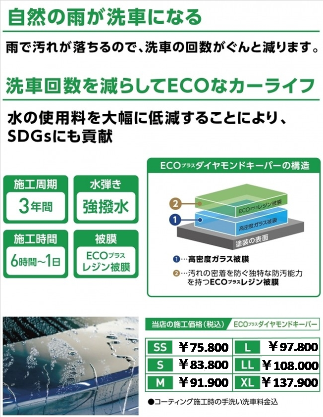 圧倒的な撥水力により雨の後でもまるで洗車をしたようにきれいになり、洗車の頻度も少なくすることができます。