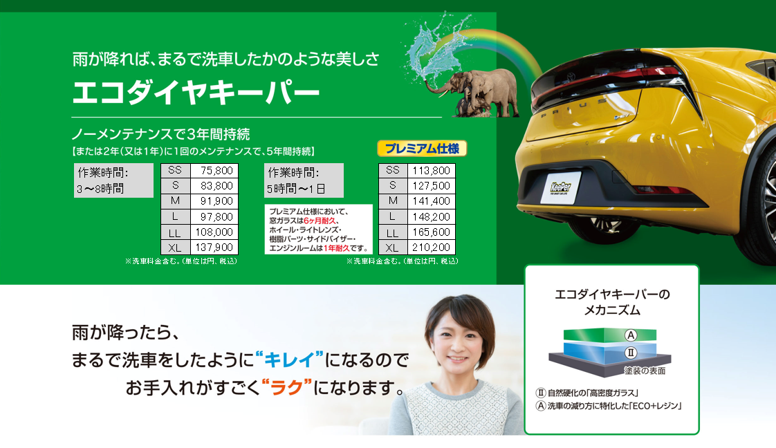 お手入れが【ラク】になり、お財布の【節約】にもつながり、洗車の回数が減る事による【節水】効果でエコに繋がるコーティング。
