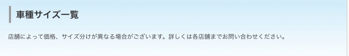 下の車両サイズ画面をタップして頂くと、車種別サイズ表が表示されます。