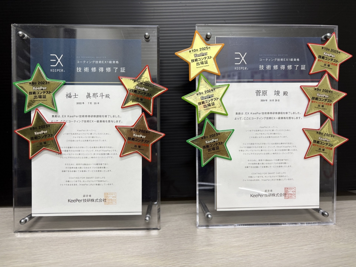 当店はコーティング技術認定店であり、さらにEXキーパーという最高級のメニューもお取り扱いしております。 ハイレベルなスタッフが揃っておりますので、安心してお車を預けていただけます。