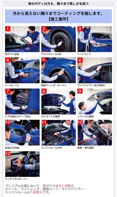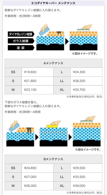 ④メンテナンス・再施工したほうがいい…基本1,3年ノーメンテナンスとなりますがメンテナンスをすることで3年の持続が5年の持続となり長期にお車のキレイを維持します。お客様ご自身でメンテナンスをお選びいただけます。またフレッシュキーパー・クリスタルキーパーは1年目以降リフレッシュ施工となり施工金額から3,000円引きで施工できます。