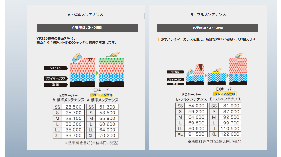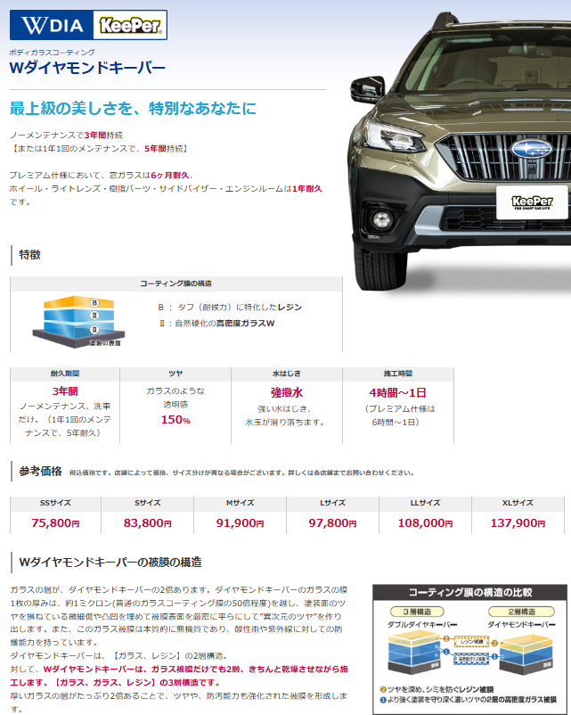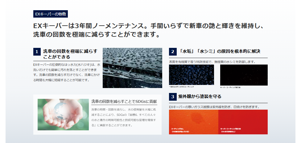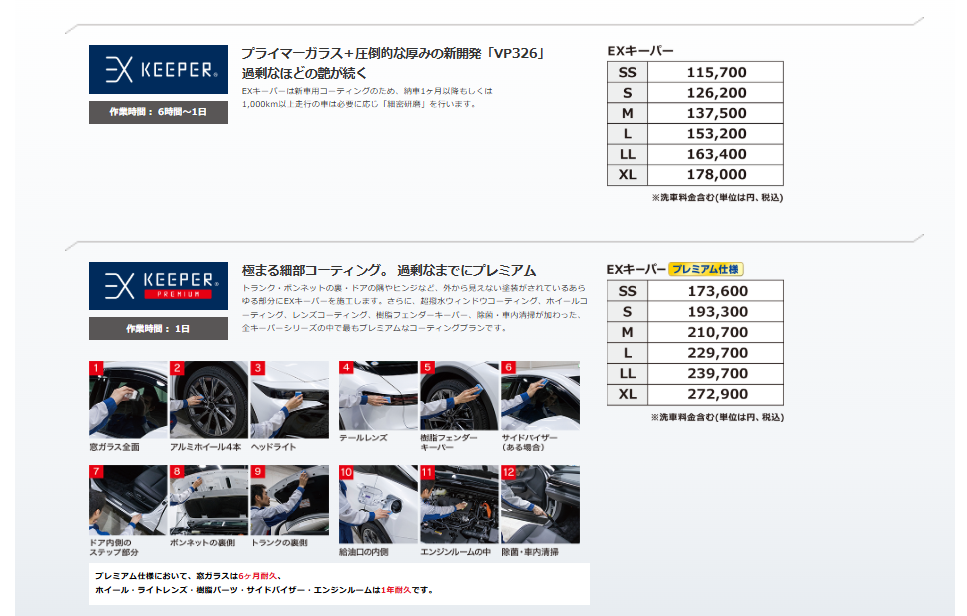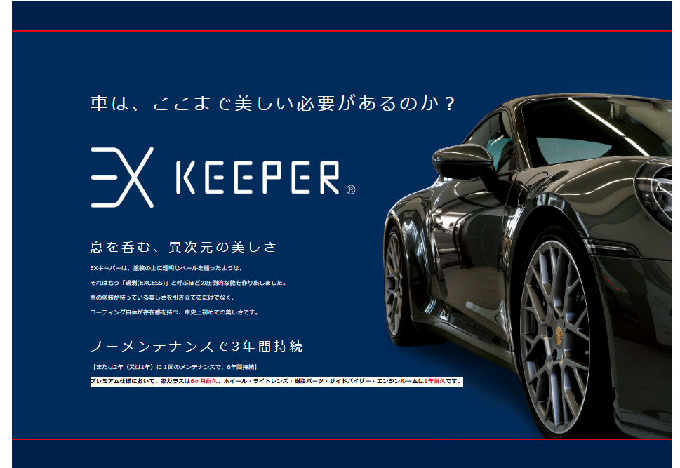 当店はコーティング技術認定店であり、さらにEXキーパーという最高級のメニューもお取り扱いしております。 ハイレベルなスタッフが揃っておりますので、安心してお車を預けていただけます。