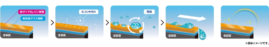 独特な防汚能力を持ち、ホコリが降り積もっても、塗装表面には密着せず、自然の雨が降れば、元々持っている撥水力で弾かれた水と一緒に、