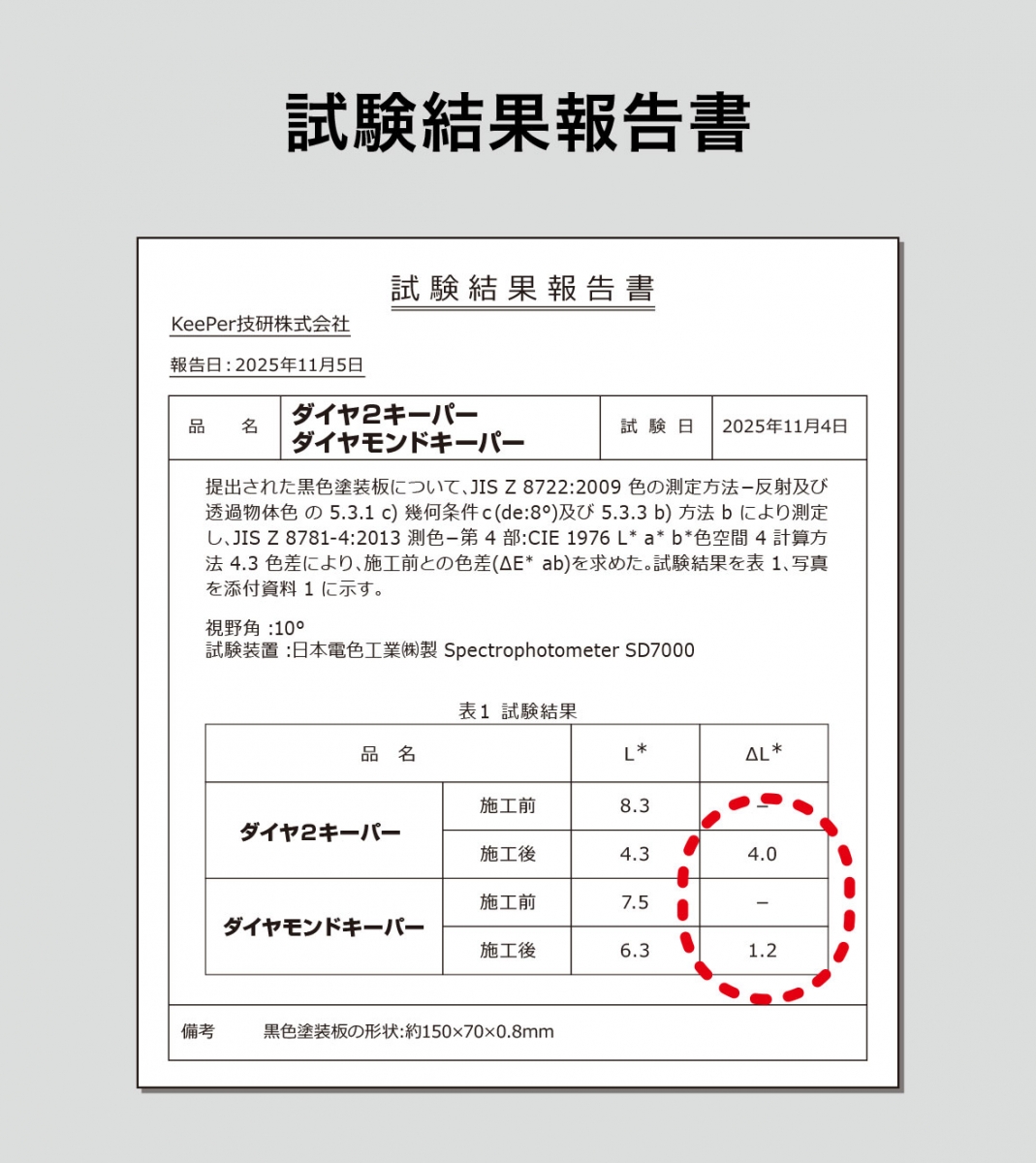 第三者機関に依頼し、黒色塗装板を使い「ダイヤIIキーパー」と「ダイヤモンドキーパー」を それぞれ半分ずつ施工。分光測色計で、光の乱反射(白ボケ)の総量を測定したところ、 本試験条件においては、明度の変化が「ダイヤモンドキーパー」に比べ2倍以上あり、 光の乱反射が抑えられる(塗装表面が平滑になる=新車の状態に近づく)事が測定されました。
