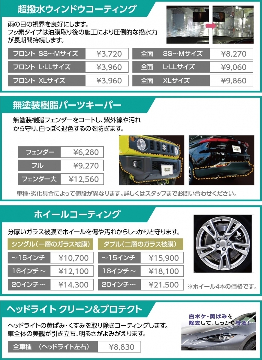 ボディのコーティングのほかにも、お車のあらゆる汚れや傷に対応したメニューもございます。