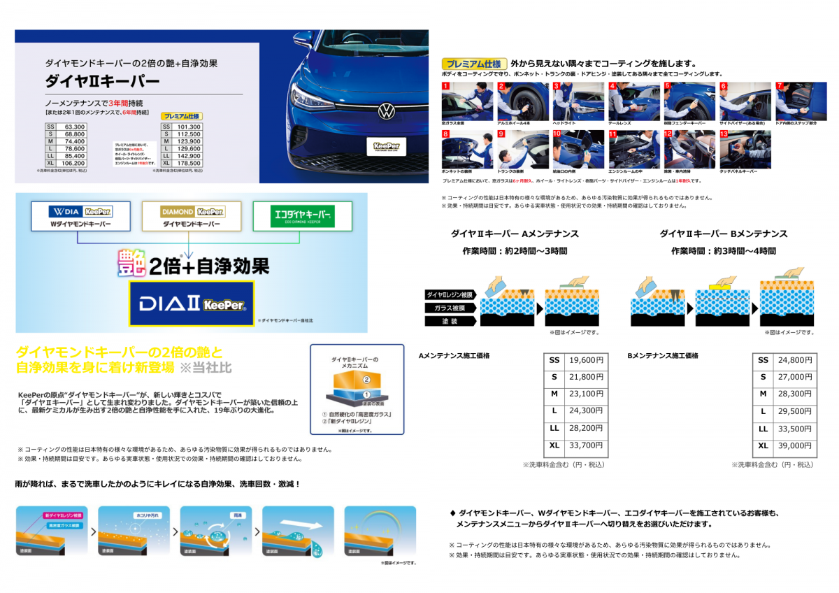 ガラスの層が、ダイヤモンドキーパーの2倍あります。ダイヤモンドキーパーのガラスの膜1枚の厚みは、約1ミクロン(普通のガラスコーティング膜の50倍程度)を越し、塗装面のツヤを損ねている微細傷や凸凹を埋めて被膜表面を厳密に平らにして”異次元のツヤ”を作り出します。また、このガラス被膜は本質的に無機質であり、酸性雨や紫外線に対しての防護能力を持っています。ダイヤモンドキーパーは、【ガラス、レジン】の2層構造。