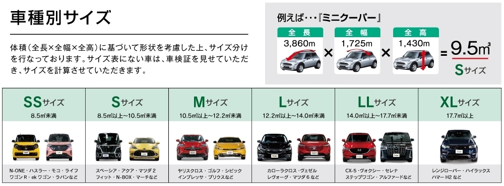公平に保つ為に『現行型』の体積(全長×全幅×全高)を基準に、形状を考慮したうえで、サイズ分けを行っています。旧型式の車も現行型のサイズ分けに準じます。