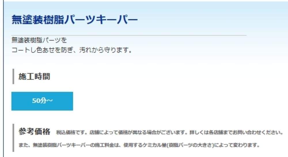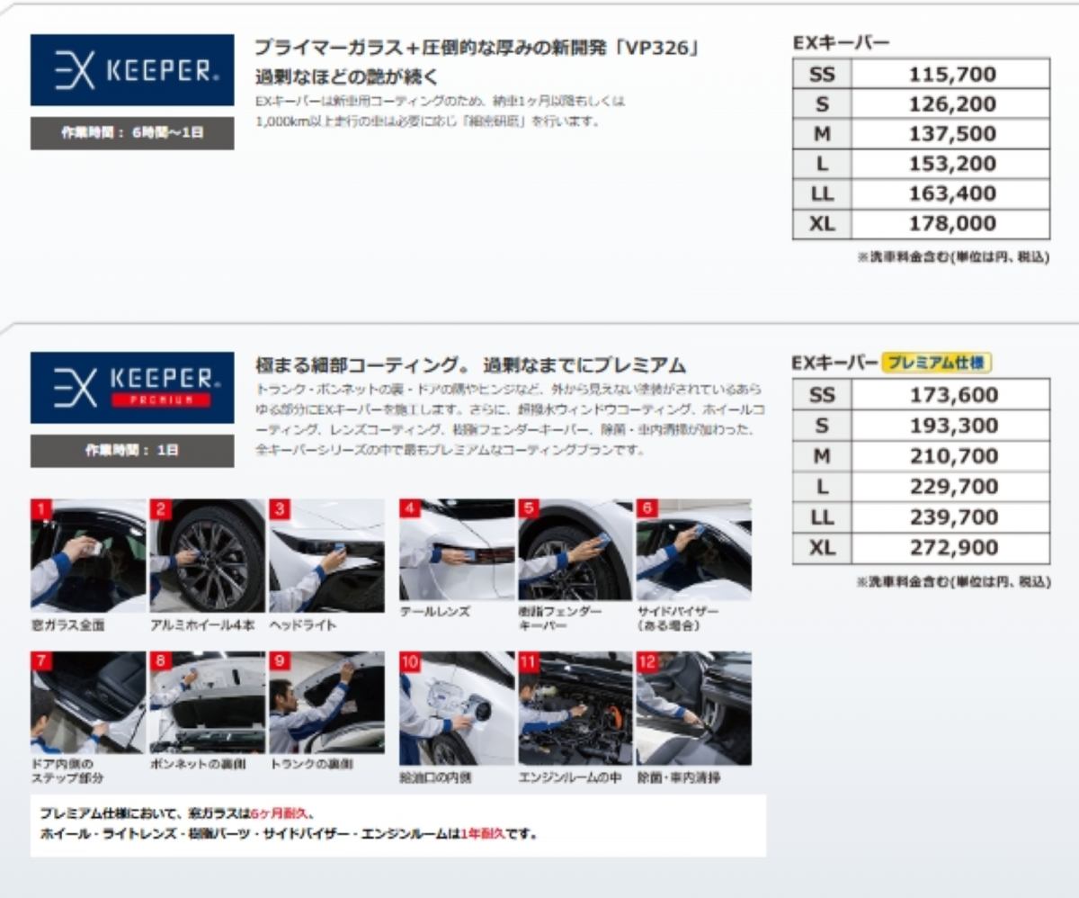 | 純水手洗い洗車 | SS : 3,230(2,740)円 S : 3,510(2,950)円 M : 3,960(3,290)円 L : 4,390,(3,640)円 LL : 4,920(4,090)円 XL : 6,000(4,910)円 | ()内はキーパー施工車価格 |