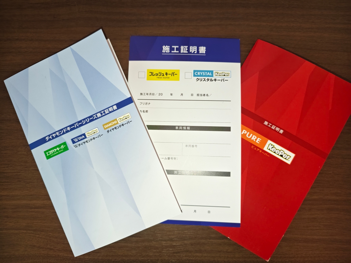 コーティング各種、安心の保険対応した施工証明書を発行しています。万一の場合の事故でも、保険で修理した箇所のコーティングも保険の対象で部分施工もできる場合がございます。