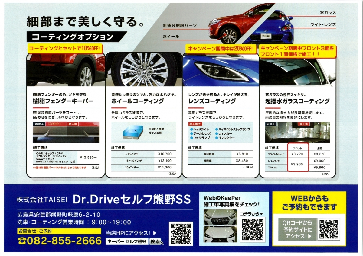 宮田油業株式会社 Dr.Driveセルフ熊野店の藤本です。コーティングキャンペーン開催中です。是非お気軽にご来店ください♪本日はダイヤモンドキーパー施工車の紹介です。...